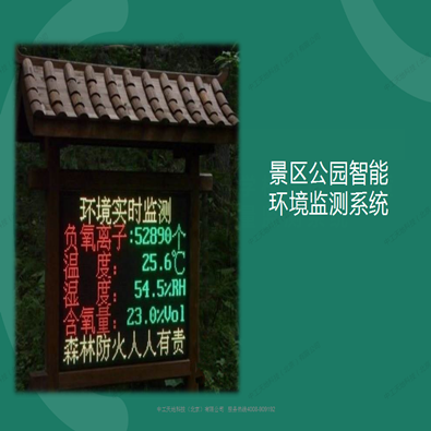 景區(qū)公園綜合環(huán)境監(jiān)測(cè)系統(tǒng)可以實(shí)現(xiàn)多維一體化,實(shí)現(xiàn)對(duì)現(xiàn)場(chǎng)溫、濕、光、二氧化碳、臭氧、負(fù)氧離子、一氧化碳、以及粉塵顆粒(PM2.5、PM10)等各類(lèi)景區(qū)環(huán)境數(shù)據(jù)的實(shí)時(shí)監(jiān)測(cè)。