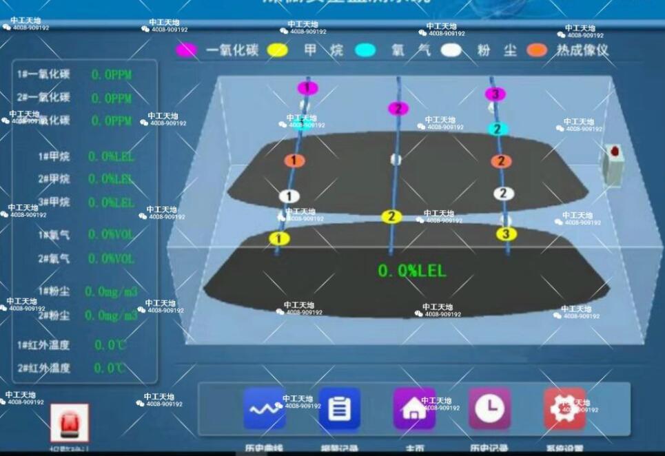 在自燃起火的初期,由于低溫氧化會產生一氧化碳,同時氧氣的濃度也發(fā)生變化,因此需要設置一氧化碳和氧氣的檢測裝置,進行實時監(jiān)測,以便早期發(fā)現,及時采取措施。由于煤發(fā)生氧化或通風系統(tǒng)故障會引起氧氣濃度降低,為了確保工作環(huán)境的安全,應保證氧氣的濃度在18%VOL以上;空氣中可燃氣體甲烷(CH4)的含量應在1.5%以下,利用甲烷比空氣易擴散的特性,在排氣流集中部位的煤場上部安裝甲烷濃度檢測儀,進行實時監(jiān)測。